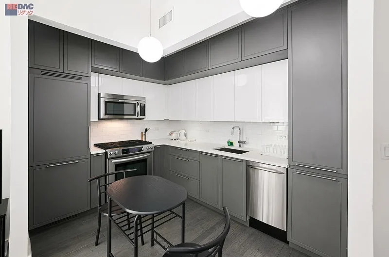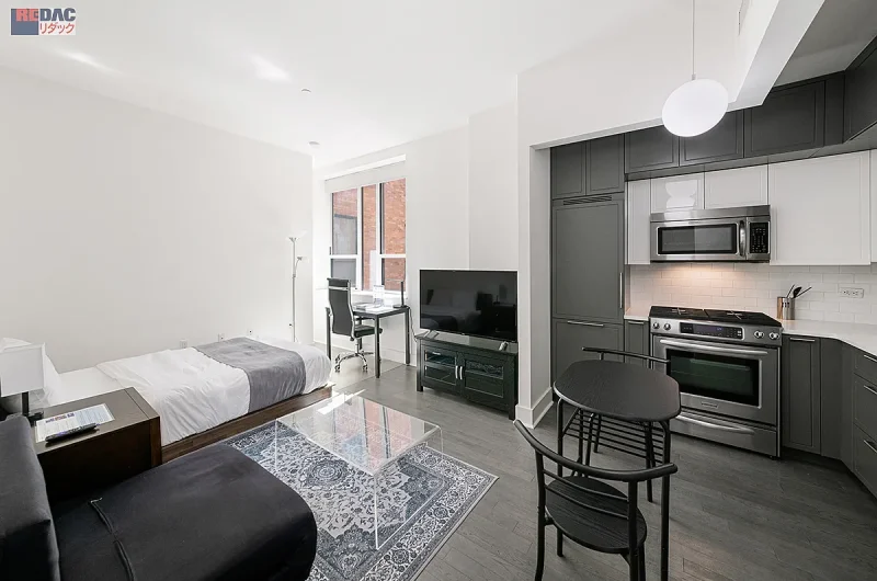 当物件は、マンハッタン・ヘルズキッチンの中心に位置し、徒歩圏内にはタイムズスクエア、ブロードウェイ、ロックフェラーセンターといった世界的に有名なスポットが揃います。周辺はお洒落なレストランやバーが立ち並ぶ人気エリアで、ハドソンヤードやプラザ地区へのアクセスも良好。職住近接を好むエグゼクティブ層に特に支持されています。#424は南向きのスタジオタイプ(約41㎡)で、明るい室内空間と機能的なレイアウトが魅力。建物全体としては、フィットネスルーム、中庭、屋上デッキ、ラウンジ、ワインセラー、託児室/プレイルームなどの多彩な共有施設を備えており、快適な都市生活を支えます。