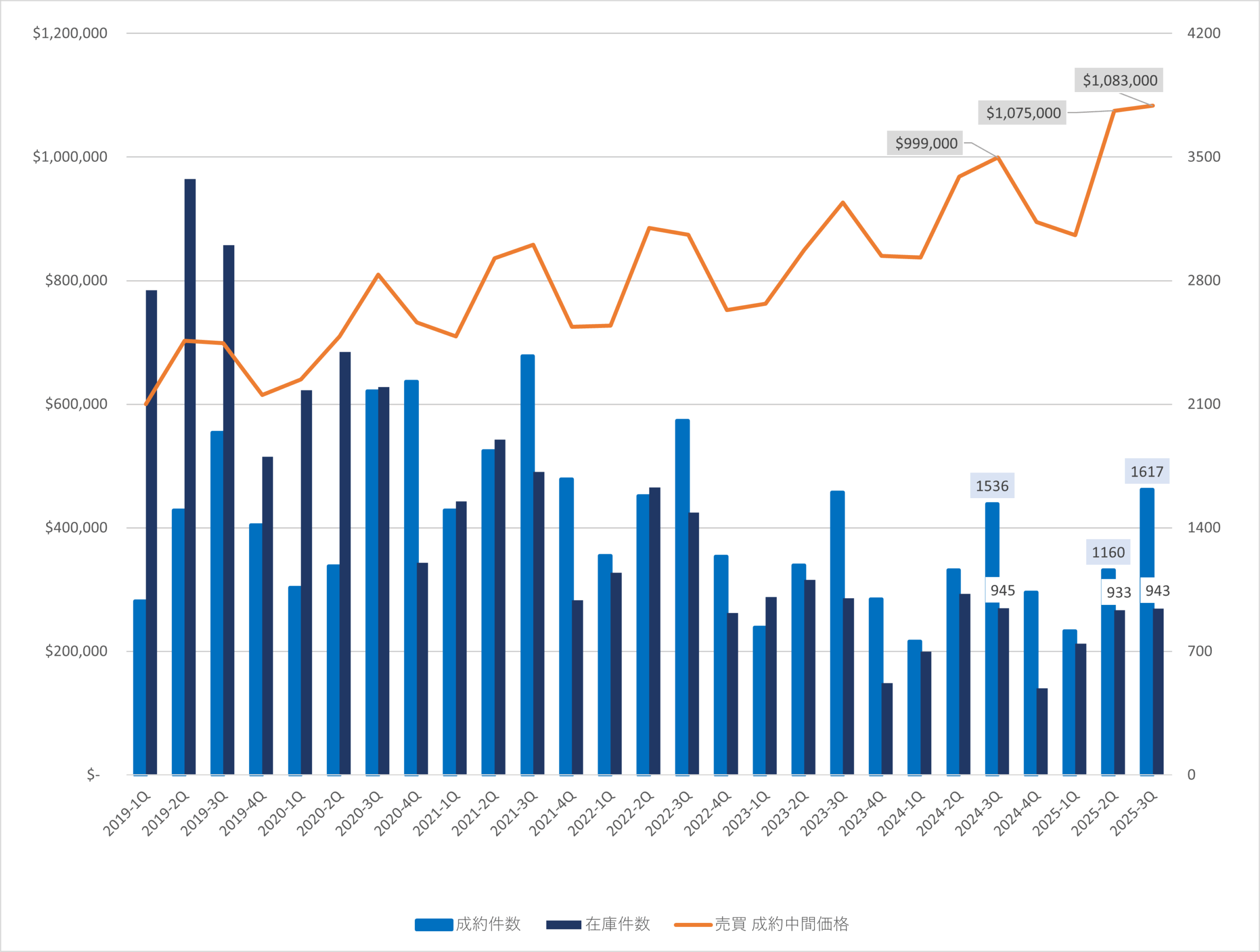 成約件数は1,617件となり、前年同期の1,536件と比較して約5%増、前期の1,160件からは約39%増と、市場の強い需要が継続していることを示しています。一方で、供給の逼迫は続いており、在庫件数は943件で推移しています。これは前年同期の945件とほぼ横ばいであり、物件が市場に出るとすぐに成約に至る流れが定着していることがうかがえます。特に立地や学区に優れた物件では複数のオファーが入るケースが多く、限られた供給の中で激しい競争が生じています。この競争による市場の価格上昇圧力は依然として強く、売買成約中間価格は$1,083,000となりました。前年同期比では約8.4%上昇し、四半期を通じて初めて100万ドルを維持しました。