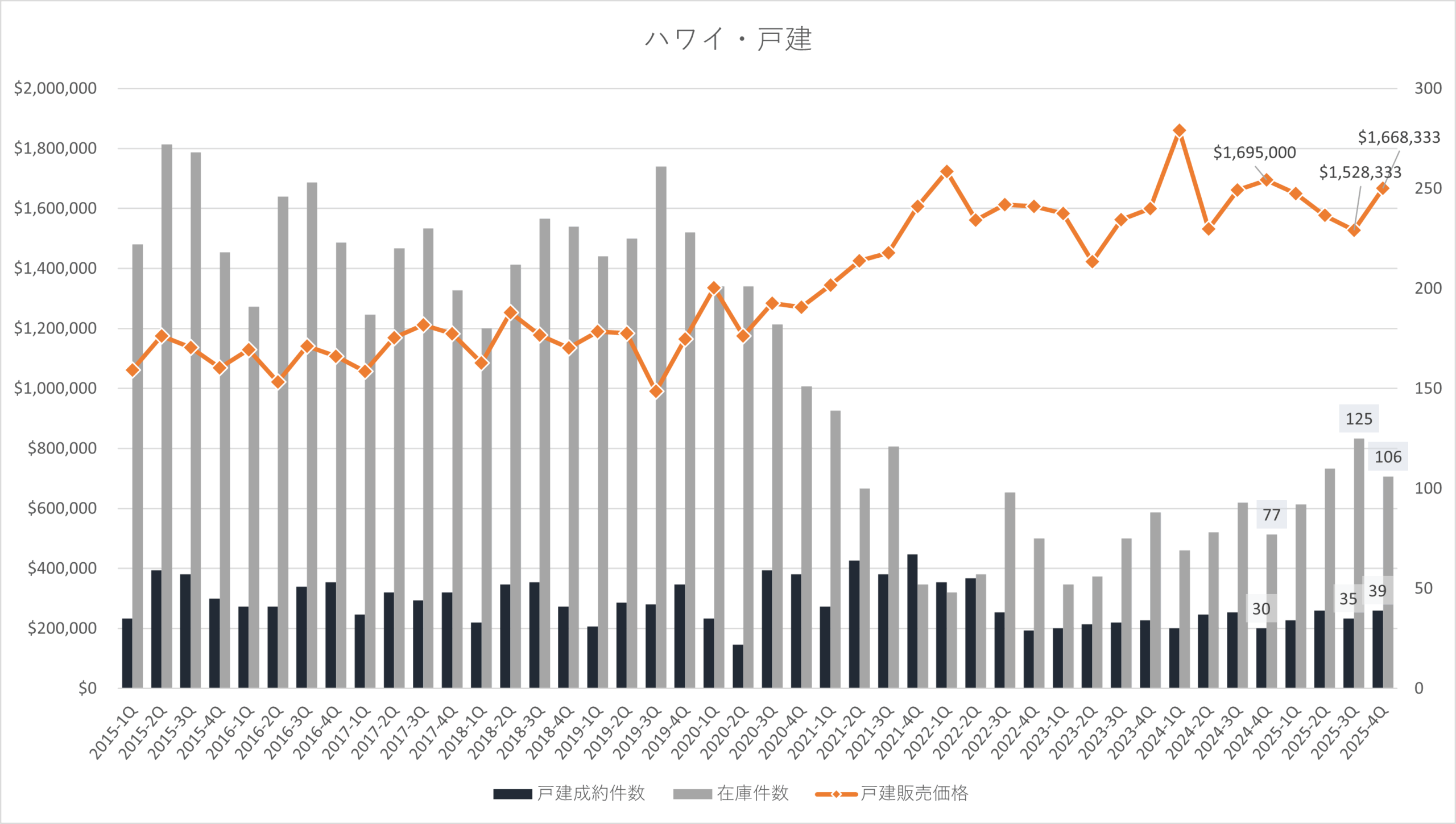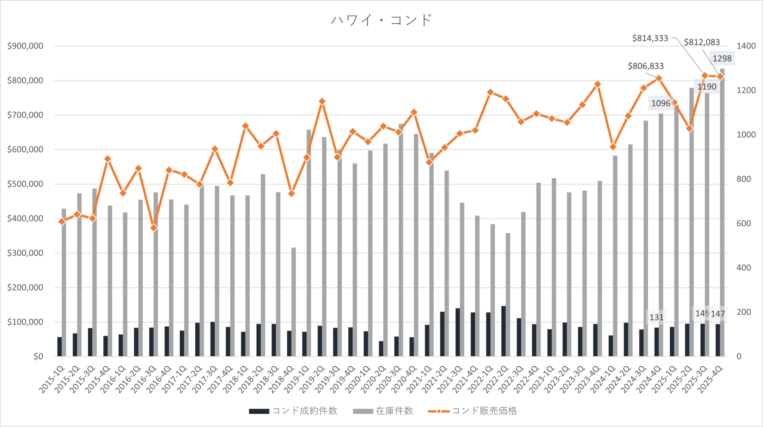 総論としてハワイの2025年4Qは戸建てが販売数、価格ともに堅調、コンドミニアムは在庫が高止まりし価格調整が進む状況が続いています。コンドミニアムの市場滞留日数増加と相まって、買い手にとっては選択肢の幅が広がりバーゲニング・パワーも優位に働き、中古物件の仕込みには好機と思われます。売り手にとっては引き続き競争力のある価格設定にしたり、改装をしたり、AIを活用したステージングなど商品力強化に努力することが求められています。