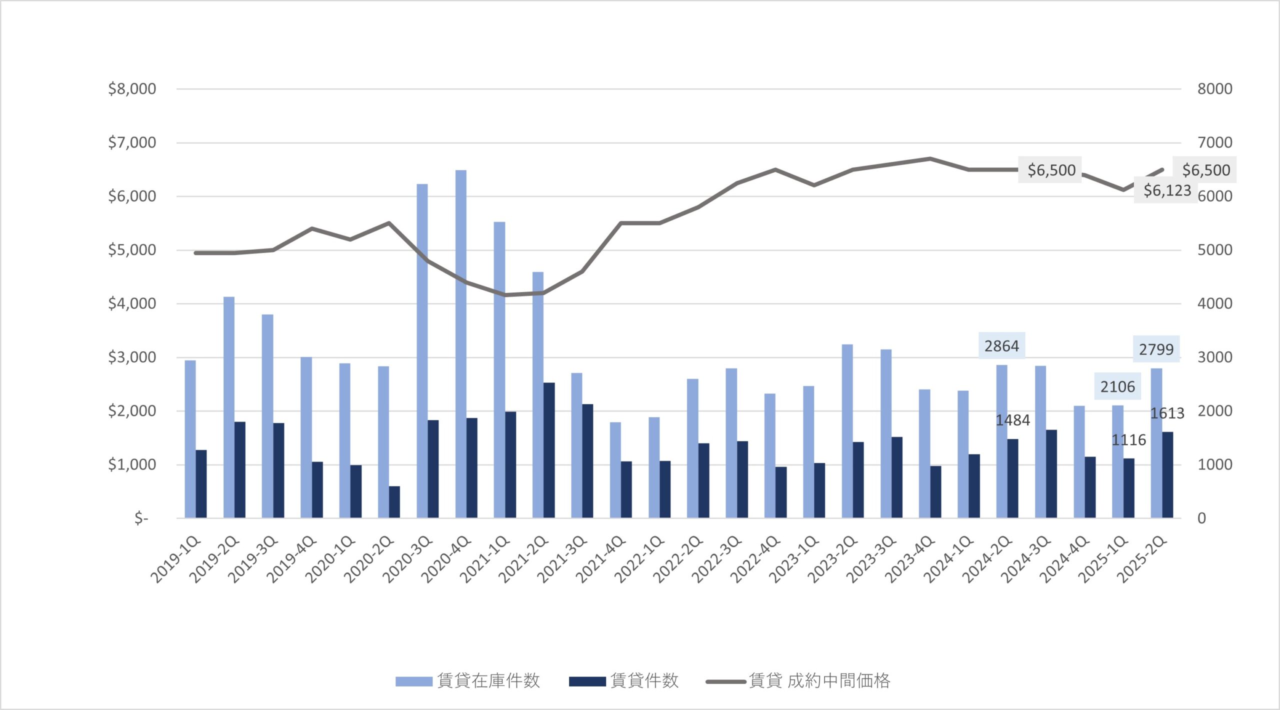 賃貸市場は前年同期比で中間価格が同額の$6,500と高止まりの状況が続いており、成約件数は+8.7%と活況を呈しています。在庫数が限られており、空室率は4月・5月ともに2%未満を記録、成約までの期間も短縮しています。