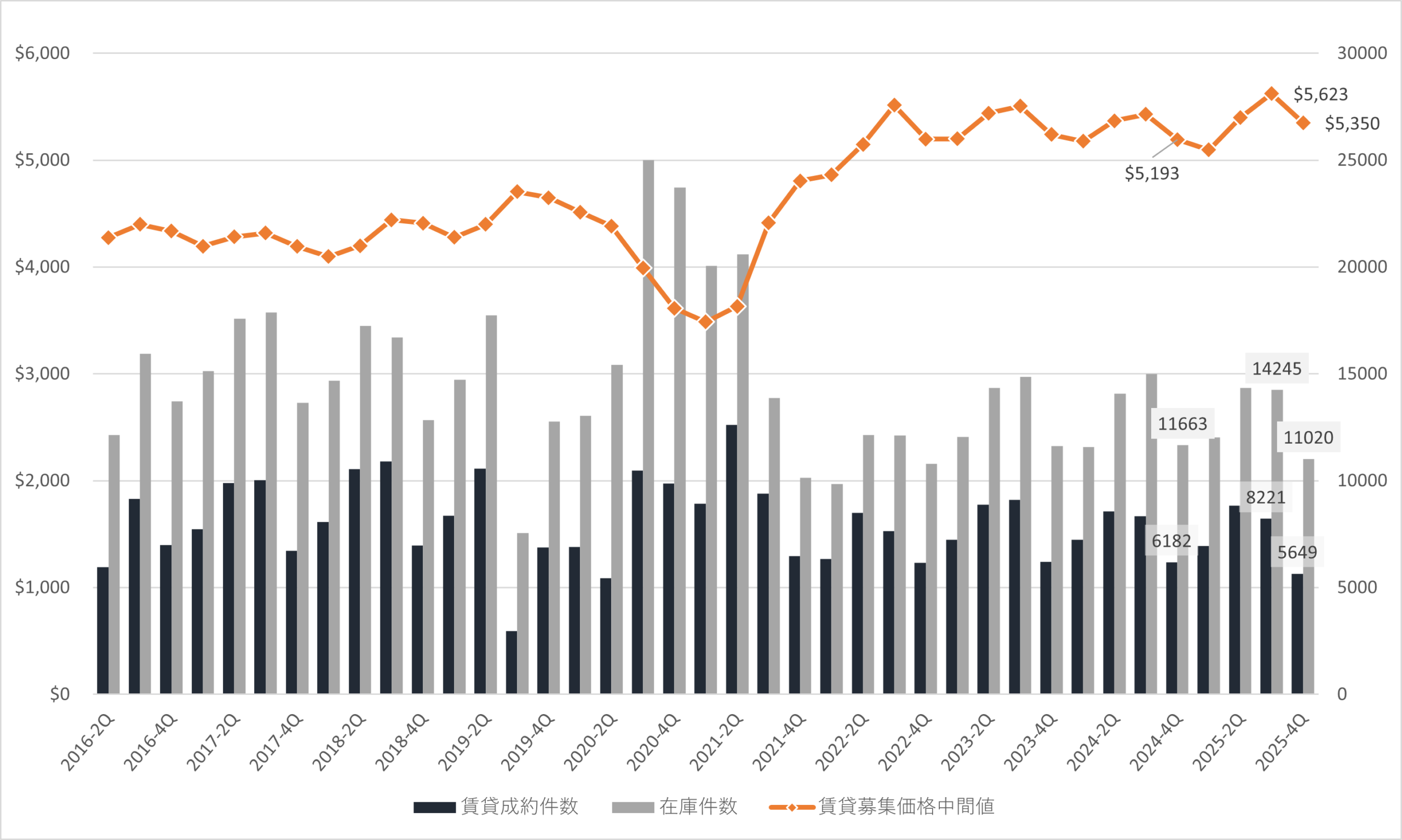 2025年第4四半期のマンハッタン賃貸市場は、募集価格中間値が$5,350と前期のピーク水準からは低下したものの、前年同期比では+3.0%と上昇基調を維持しました。夏の繁忙期終了に伴う季節調整が主因であり、需給環境そのものが大きく緩んだわけではありません。成約件数は5,649件(前年同期比▲8.6%)と減少しましたが、在庫件数も11,020件まで減少しており、空室率は引き続き低水準で推移しています。特に、利便性の高い立地や築浅・管理状態の良い物件では競争力が高く、賃料の下落余地は限定的です。2025年後半を通じて見られた「低在庫 × 高水準賃料」の構図は4Qにおいても継続しており、短期的には落ち着きを見せつつも、中長期的には高止まりしやすい賃貸市場環境が続く見通しです。